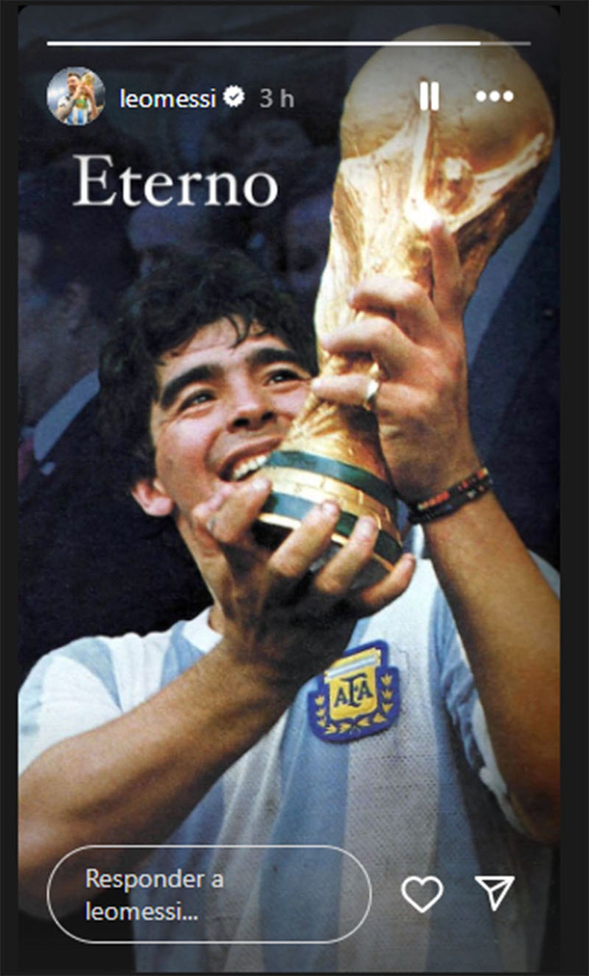Con una foto icónica del Pelusa con la Copa del Mundo conquistada en 1986, el capitán de la Selección argentina subió una historia con un breve pero contundente mensaje: “Eterno”, reflejando la profunda admiración y gratitud de astro a astro, en el cual siempre consideró una figura única e irrepetible en el fútbol.