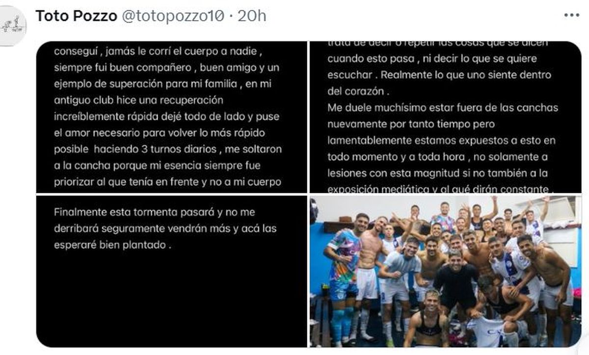 El volante de Godoy Cruz Tomás Pozzo sufrió una severa lesión en su rodilla izquierda y manifestó su dolor a través de las redes sociales con un mensaje conmovedor.