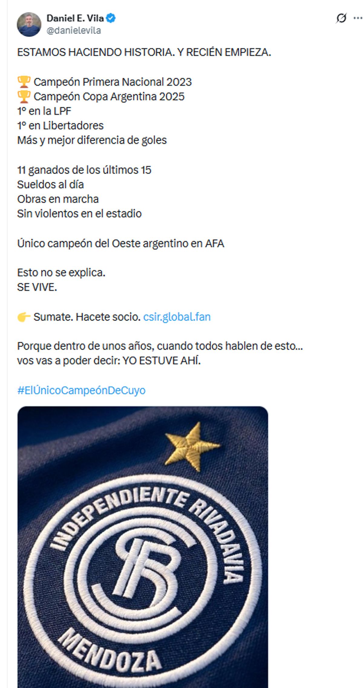 Luego agregó: "Sueldos al día, Obras en marcha, Sin violentos en el estadio, Único campeón del Oeste argentino en AFA" y expresó: "Esto no se explica. SE VIVE".