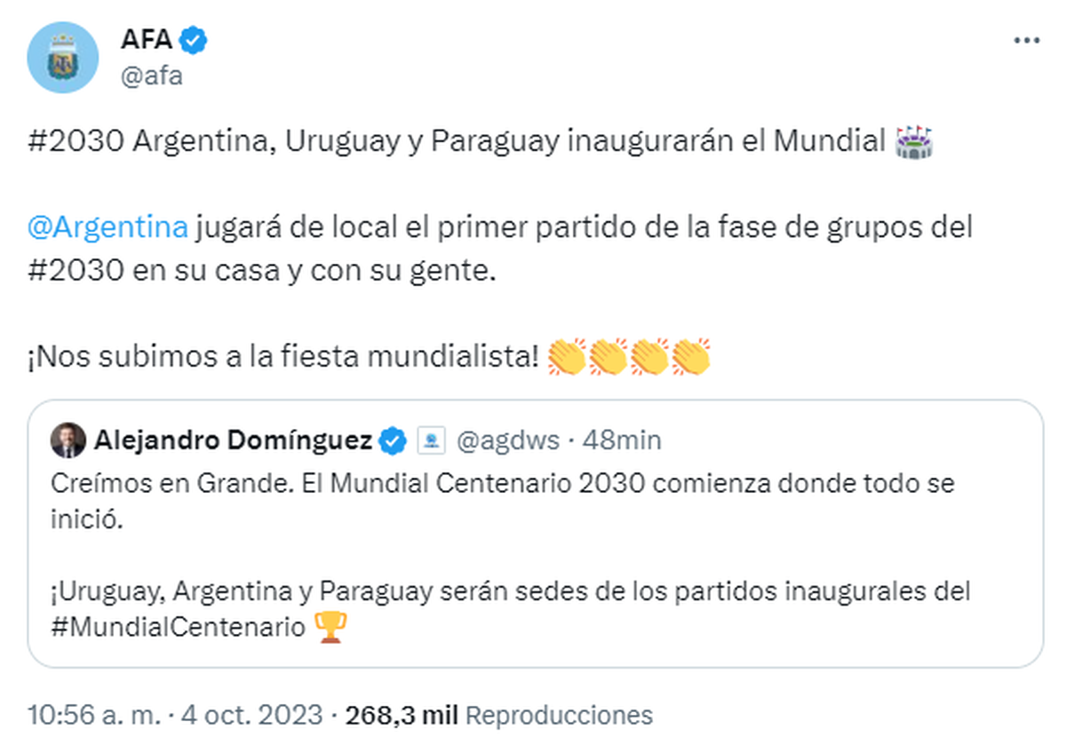 Por su parte, la Asociación del Fútbol Argentino (AFA), citó la publicación del presidente del ente regulador sudamericana y agregó: "#2030 Argentina, Uruguay y Paraguay inaugurarán el Mundial @Argentina jugará de local el primer partido de la fase de grupos del #2030 en su casa y con su gente. ¡Nos subimos a la fiesta mundialista!".