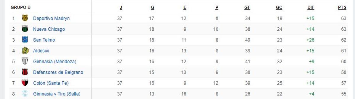 Gimnasia y Esgrima se ubica actualmente quinto en la Zona B con 60 puntos, tres menos que los líderes Deportivo Madryn (+15 de diferencia de gol) y Nueva Chicago (+14).