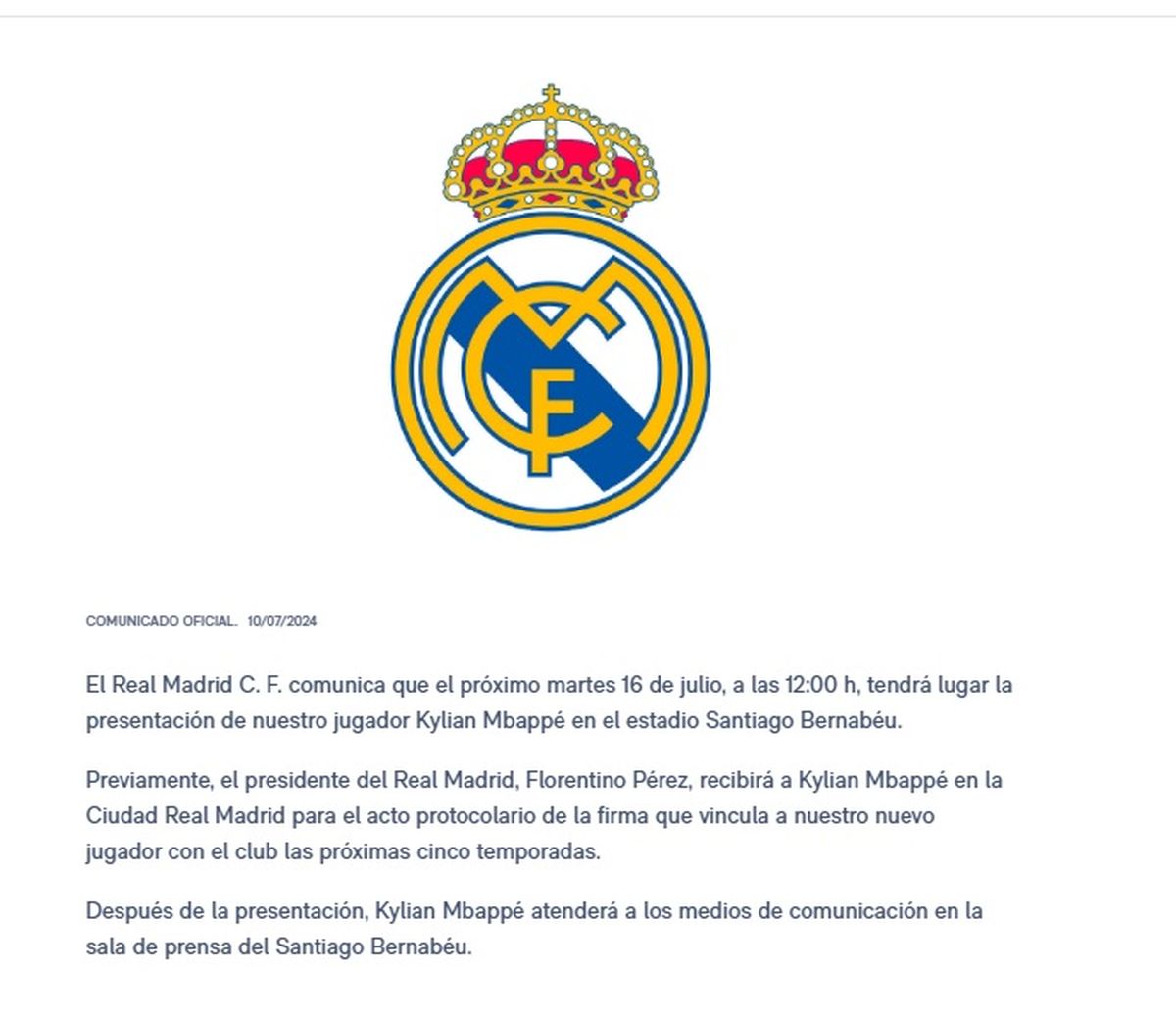 Y añadieron: “Después de la presentación, Kylian Mbappé atenderá a los medios de comunicación en la sala de prensa del Santiago Bernabéu”.
