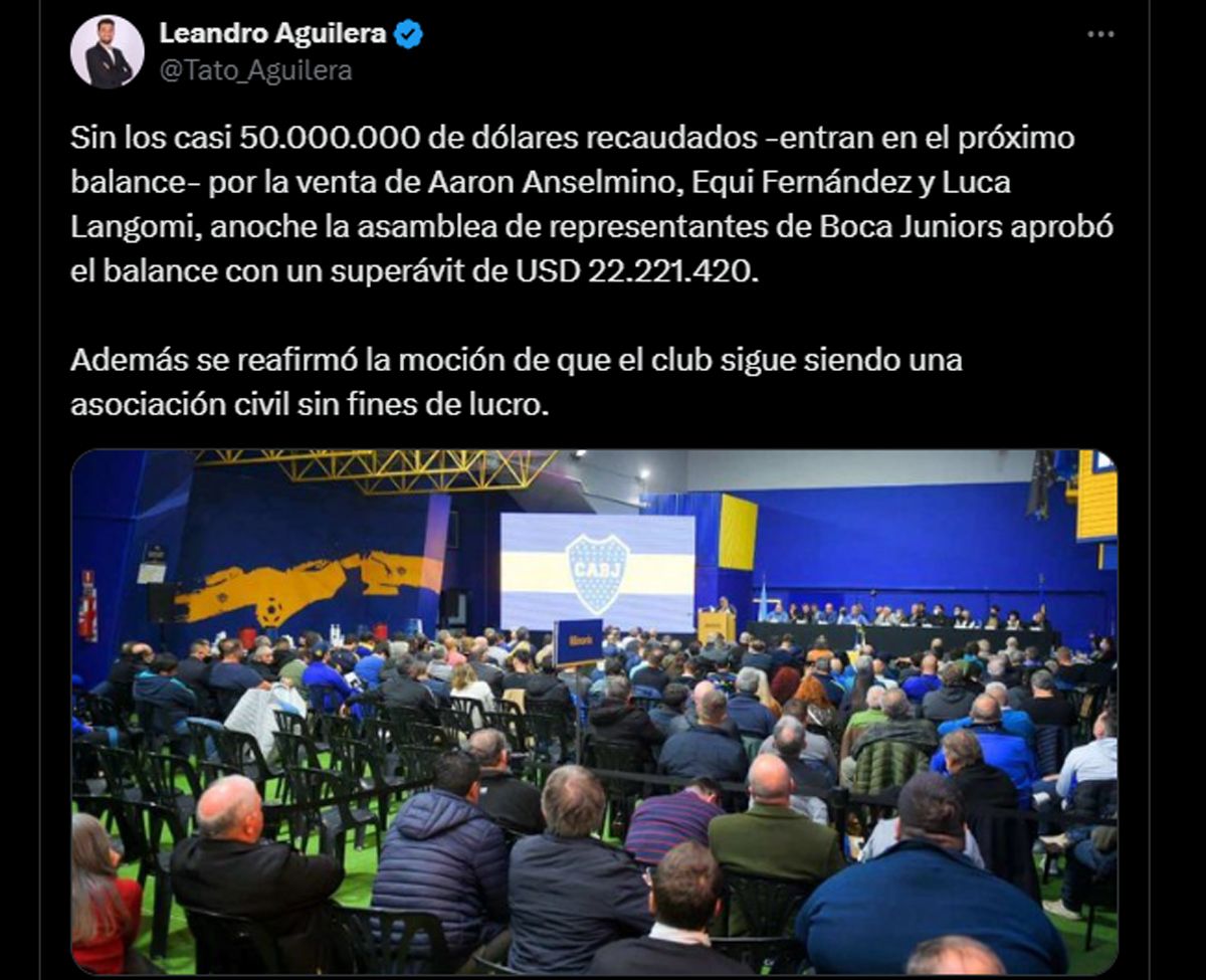 La comisión directiva de Boca, encabezada por Juan Román Riquelme, presentó su balance a la Asamblea de Representantes donde consignó que se registró un superávit de 22 millones de dólares y un aumento patrimonial de 16,44%.
