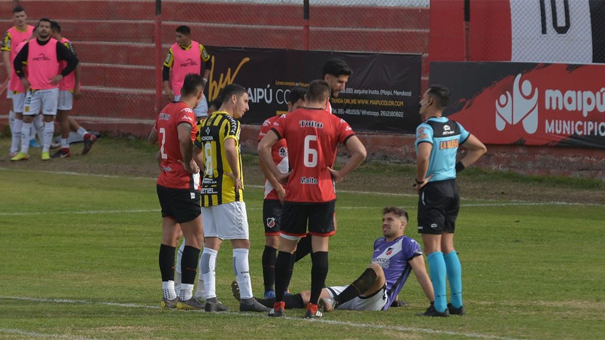 El volante del Deportivo Maipú Matías Viguet tuvo que abandonar el campo de juego a los 5 minutos del segundo tiempo por un fuerte golpe con su compañero Juan Cruz Bolado.