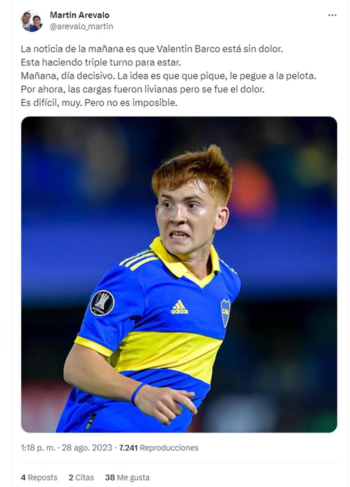 En tanto, el "Colo" Barco, quien sufrió una lesión muscular grado 1/2 del músculo psoas ilíaco izquierdo en la ida ante Racing, evoluciona favorablemente y se entrenó en doble turno el fin de semana. Si bien en el "Xeneize" todavía hay esperanzas de que pueda llegar a estar desde el comienzo, saben que es muy complejo.