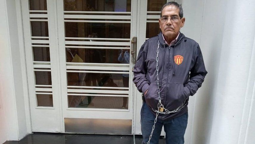 El vicepresidente de Sarmiento de Chaco, Gerardo Escobar, se encadenó este jueves a la puerta de AFA a la esperar de ser atendido por el presidente de la entidad, Claudio Tapia, ya que considera que a su club le "robaron el ascenso" a la Primera B Nacional.