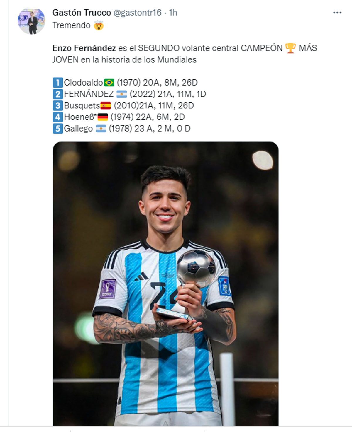 "¿Qué le digo a los más chicos? Que luchen por sus sueños, que escuchen a sus padres, a sus hermanos. Que estudien y sobre todas las cosas, que sean buenas personas", destacó Enzo Fernández, de 21 años, quien se desempeña en Benfica, de Portugal y fue una de las grandes revelaciones de la Copa del Mundo, de hecho fue premiado por la FIFA como el mejor jugador joven, y anotó un golazo ante México en la fase de grupos que fue elegido entre los mejores de la competencia.