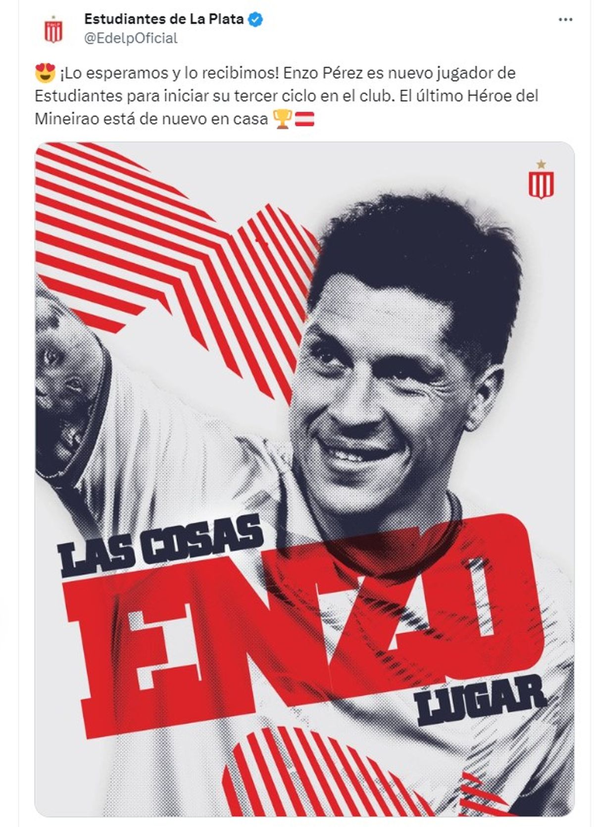 Una hora después se publicó el anuncio oficial: "¡Lo esperamos y lo recibimos! Enzo Pérez es nuevo jugador de Estudiantes para iniciar su tercer ciclo en el club. El último Héroe del Mineirao está de nuevo en casa".