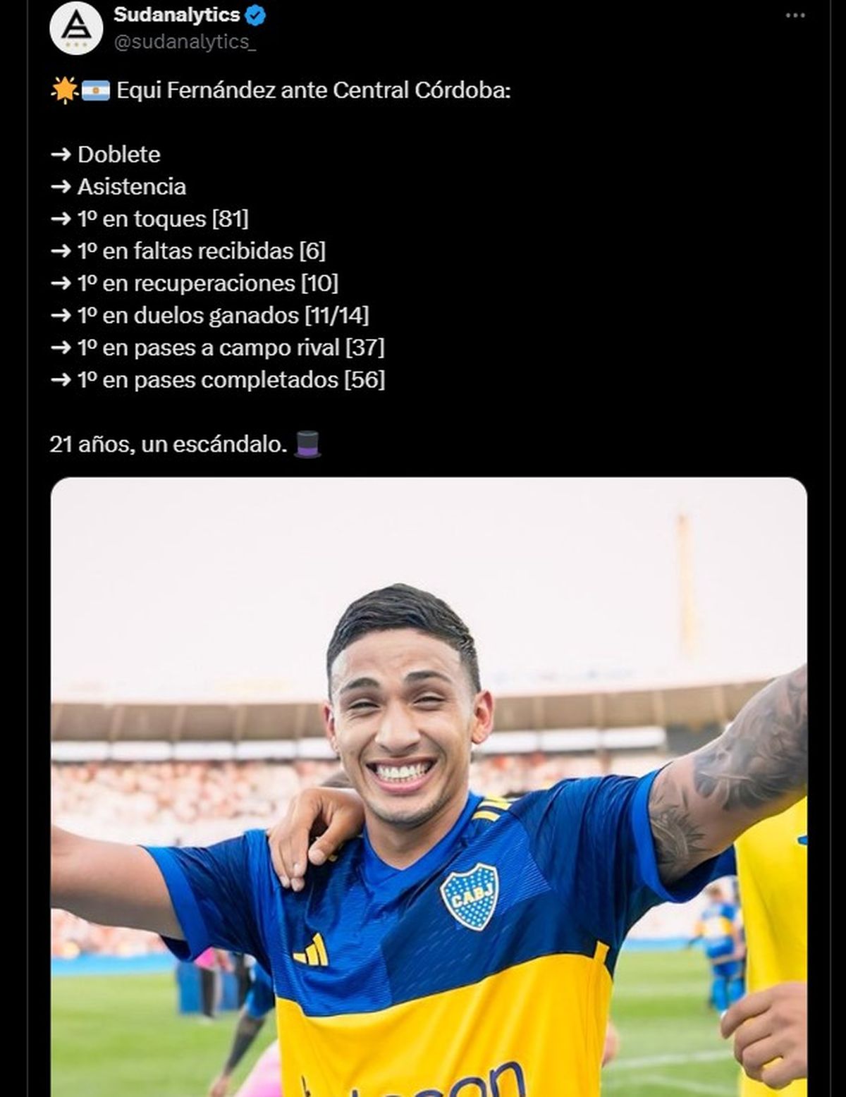 Eso fue en 2022 ya que Fernández debutó en Boca y jugó 3 partidos en 2021, pasó una temporada al Matador, volvió en 2023 y este año renovó su contrato hasta fines del 2028 y con una cláusula de rescisión de 20.000.000 de dólares.