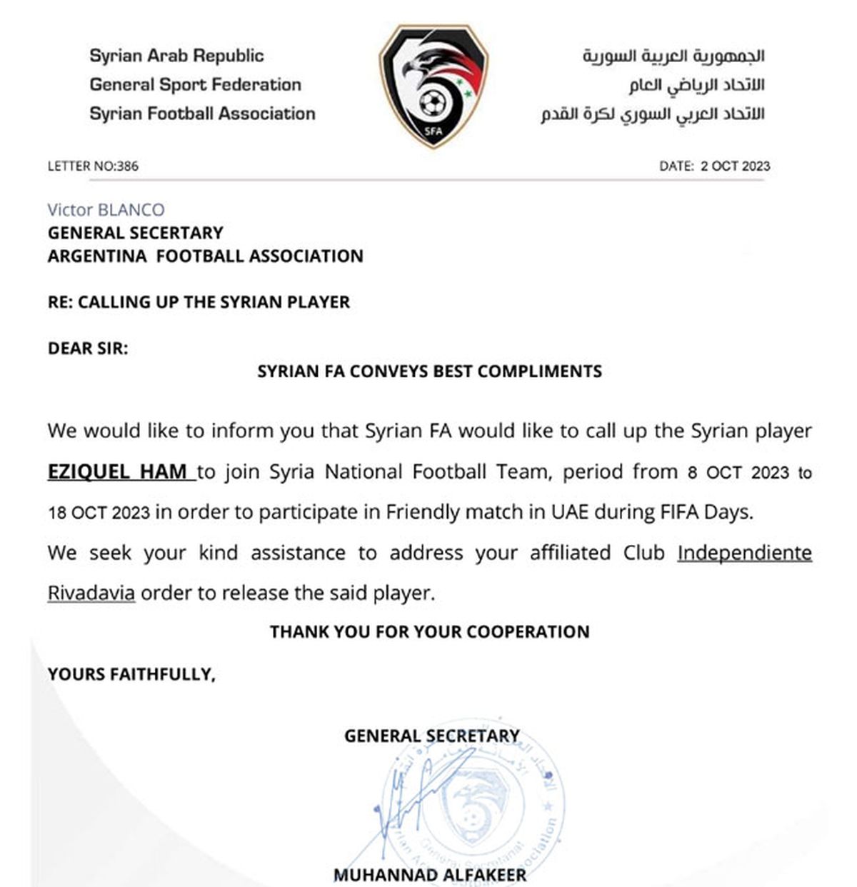 Ezequiel Ham fue citado por Héctor Cúper, actualmente DT de la Selección de Siria, para afrontar dos partidos de la fecha FIFA, entre el 8 y 18 de octubre próximo.