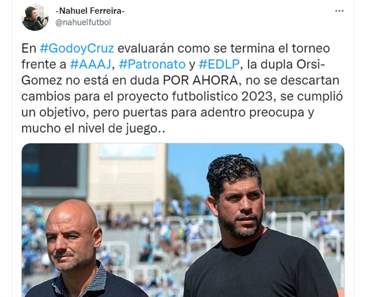 RLa dupla técnica Favio Orsi - Sergio Gómez, que cumplió el objetivo de mantener a Godoy Cruz en Primera División, no seguirían dirigiendo al Tomba tras la finalización del actual torneo de la Liga Profesional.