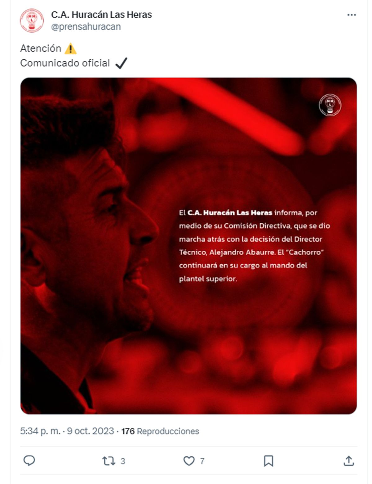 Alejandro Abaurre seguirá siendo el entrenador de Huracán Las Heras. Este lunes se confirmó la continuidad del Cachorro.
