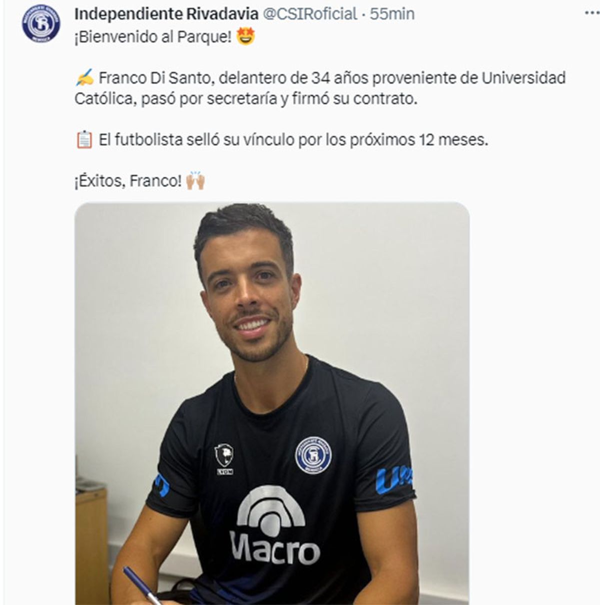 El delantero mendocino Franco Di Santo es nuevo jugador de Independiente Rivadavia, tras firmar su contrato este sábado con el club del Parque. El futbolista local afrontará con el equipo azul la Copa de la Liga Profesional y la Copa Argentina.