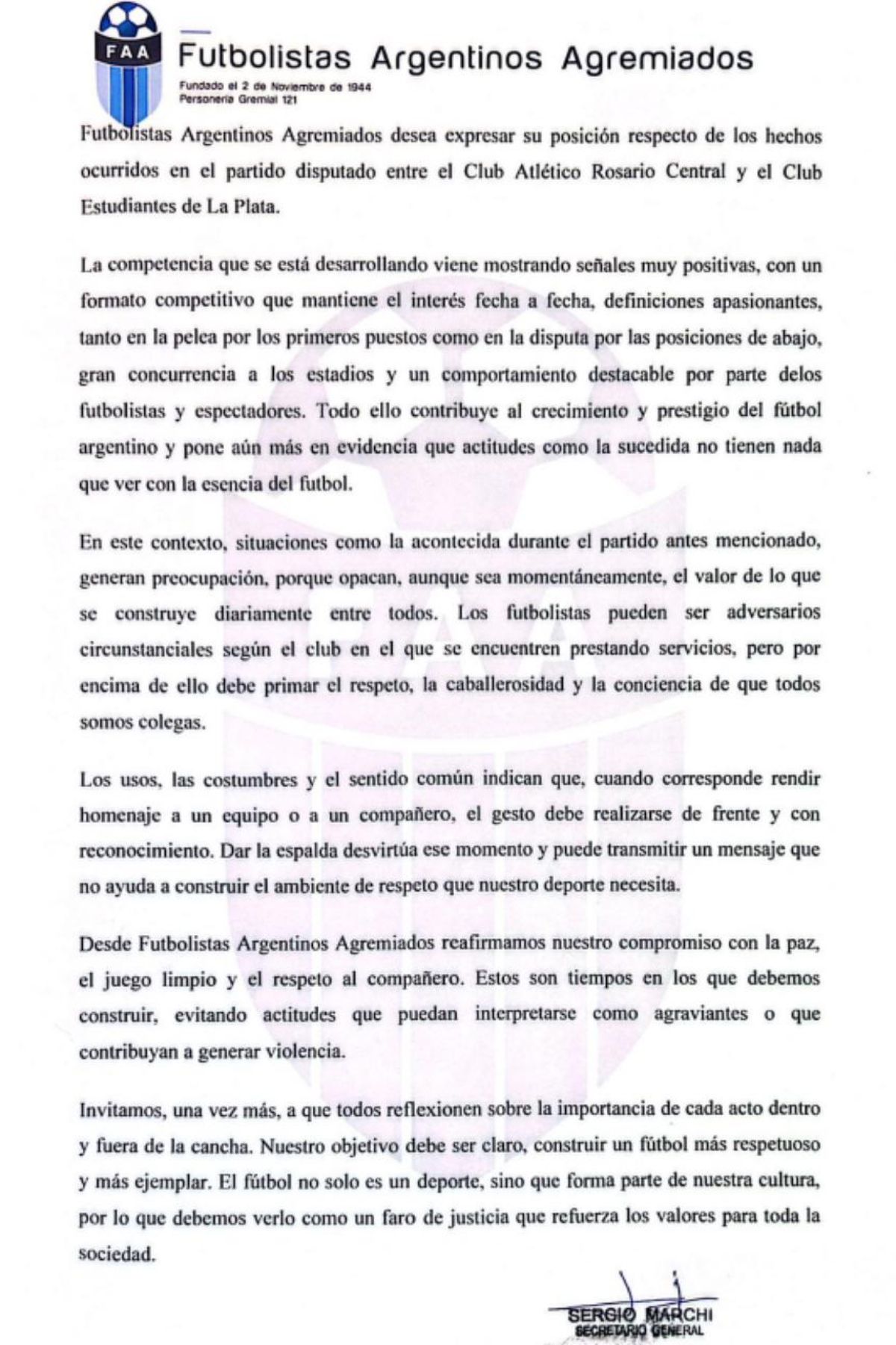 Futbolistas Argentinos Agremiados se expresó con un fuerte comunicado respecto a la actitud de los jugadores de Estudiantes al recibir a Rosario Central