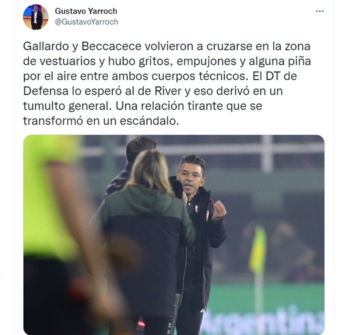“¡¿Qué hace, está loco?!”, fue la pregunta que le hizo el Muñeco al cuarto árbitro, quien también estaba atónito por lo estaba sucediendo. Lejos de quedarse con eso, Gallardo lo miró a Beccacece y le recriminó por su accionar al ingresar al campo de juego para evitar un lateral.