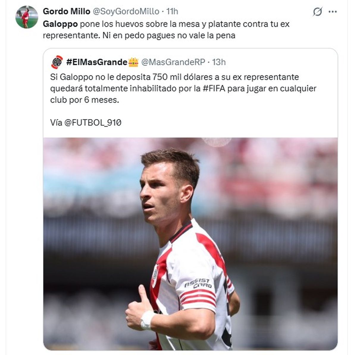 Giuliano Galoppo podría ser inhabilitado por la FIFA a causa de una deuda y los hinchas de River reaccionaron de manera insólita en las redes sociales pidiendo al futbolista que no pague para que no pueda jugar.