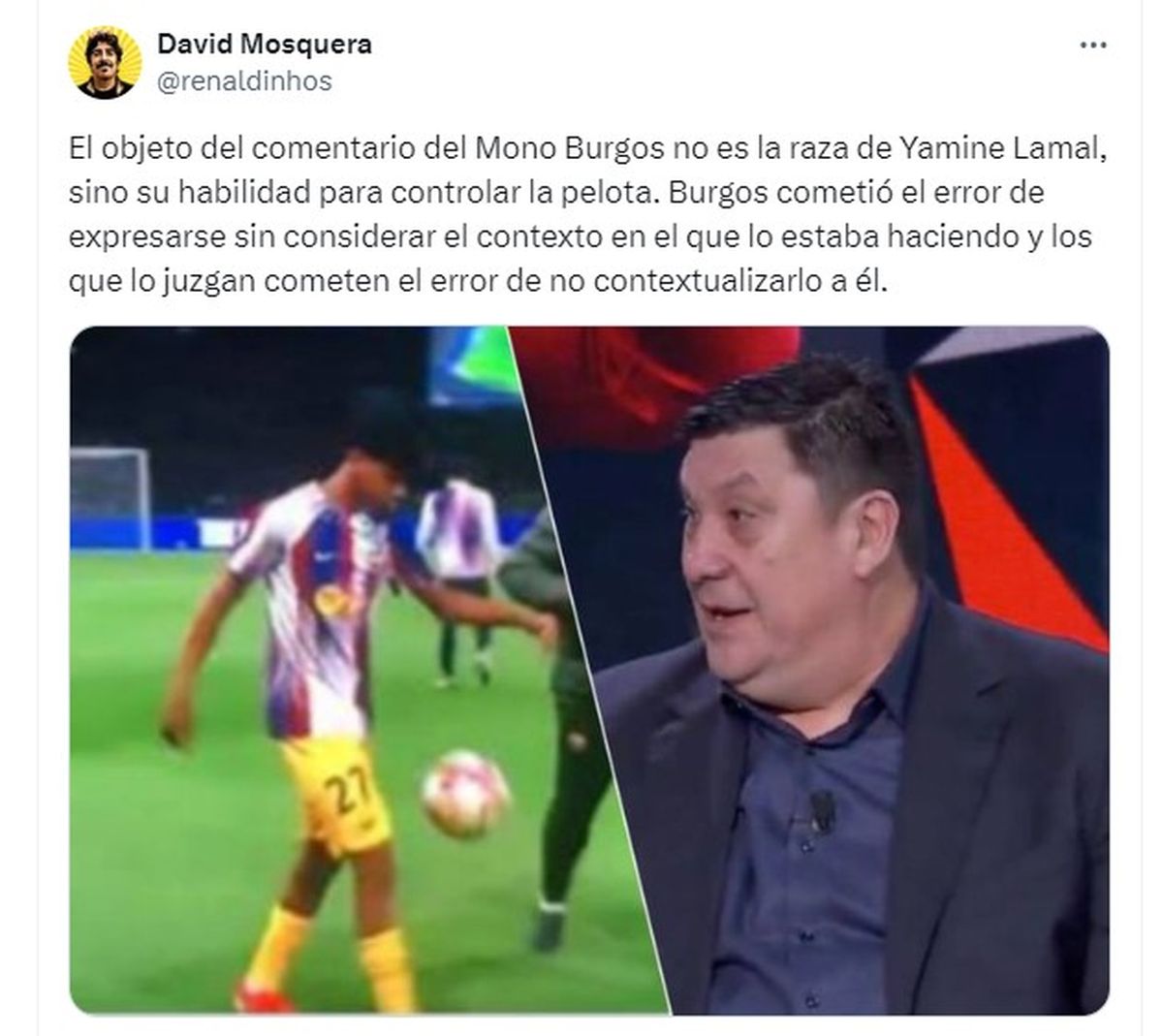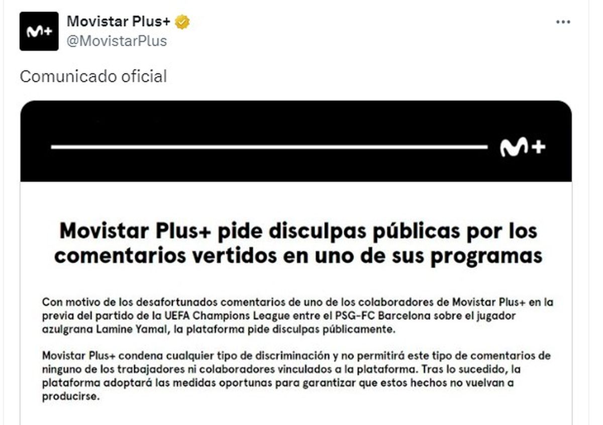 "Hago este comunicado reiterando mis disculpas por mis palabras en el programa de ayer. No fue mi intención hacer daño de ningún tipo a Lamine Yamal, a la gente del FC Barcelona, a los jugadores, a la UEFA, ni a la plataforma Movistar Plus+ en donde trabajo. Al hacer mi comentario elegí hacer un chiste sobre la calidad y halagar las virtudes, en ningún caso fue sobre ninguna etnia ni clase social", explicó Germán Adrián Ramón Burgos en sus redes sociales.