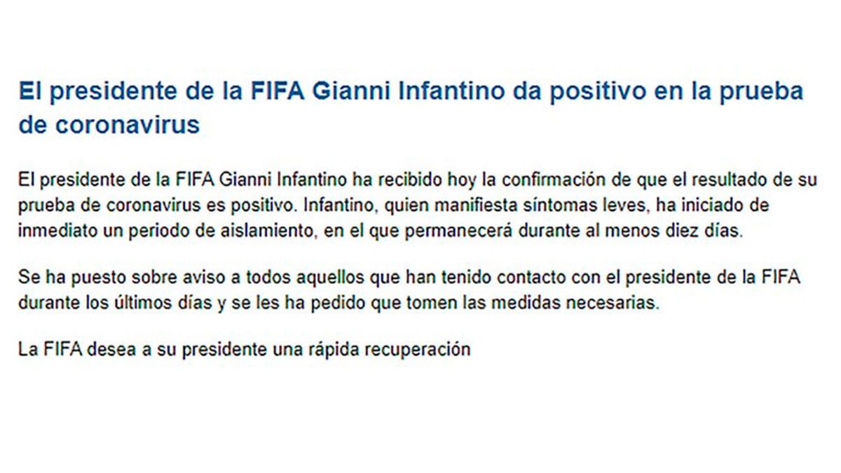 Así lo informó el organismo que rige el fútbol mundial a través de un comunicado, donde detalló que Infantino "recibió este martes los resultados de las pruebas".