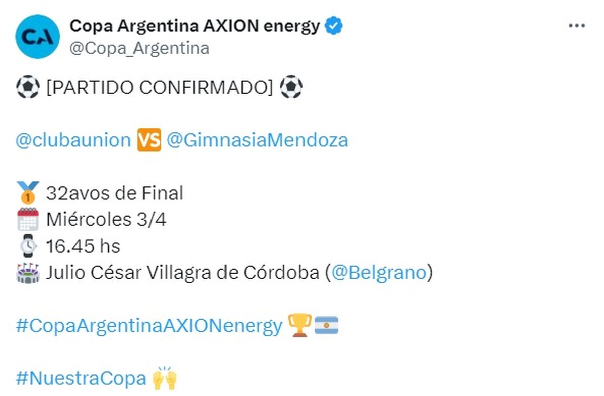 Gimnasia y Esgrima ya tiene cita para jugar Copa Argentina en los próximos días. En el Julio César Villagra de Córdoba, el Lobo enfrentará a Unión el 3 de abril, por los 32vos de final del torneo.