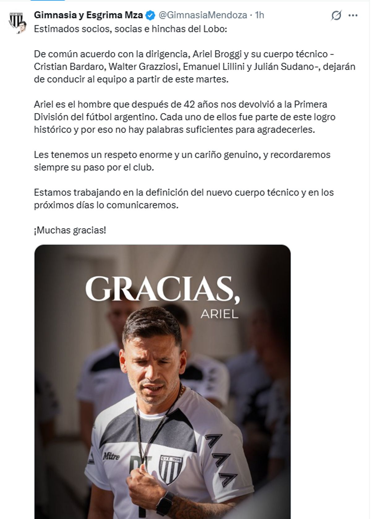En el mismo comunicado que anunció la salida de Ariel Broggi la dirigencia de Gimnasia y Esgrima reveló que está "trabajando en la definición del nuevo cuerpo técnico y en los próximos días lo comunicaremos".