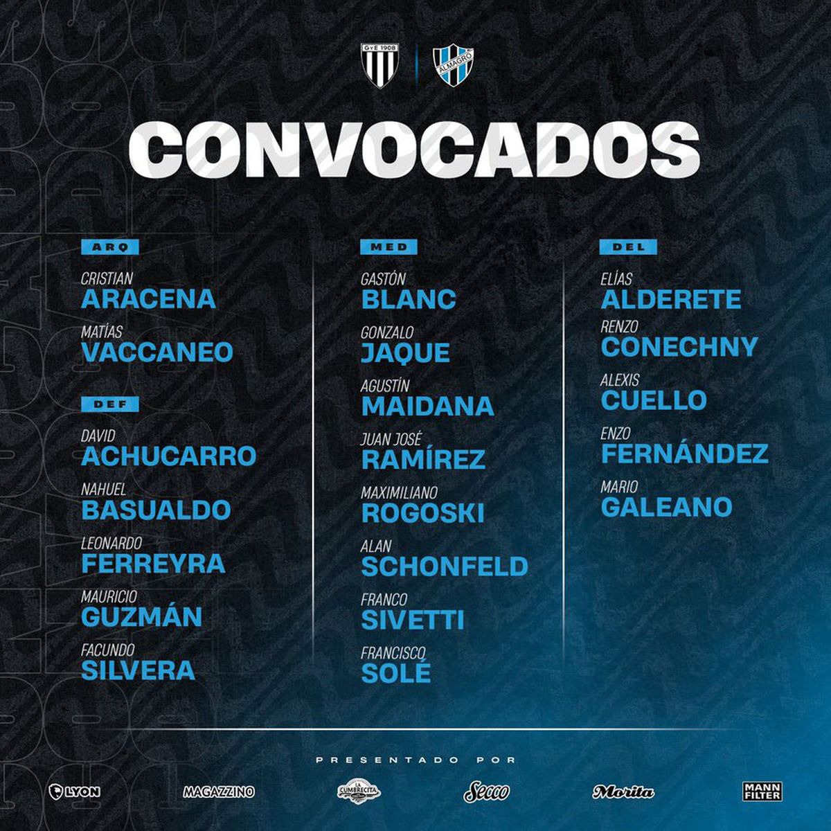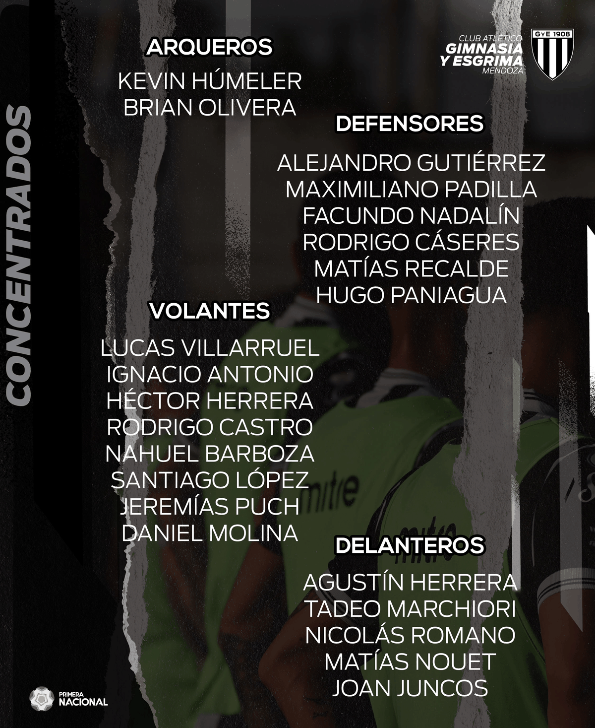 Gimnasia y Esgrima: Brian Olivera; Facundo Nadalín, Rodrigo Cáseres o Alejandro Gutiérrez Arango, Maximiliano Padilla y Matías Recalde; Santiago López, Lucas Villarruel y Rodrigo Castro; Matías Nouet, Nicolás Romano y Agustín Herrera. DT: Joaquín Sastre.