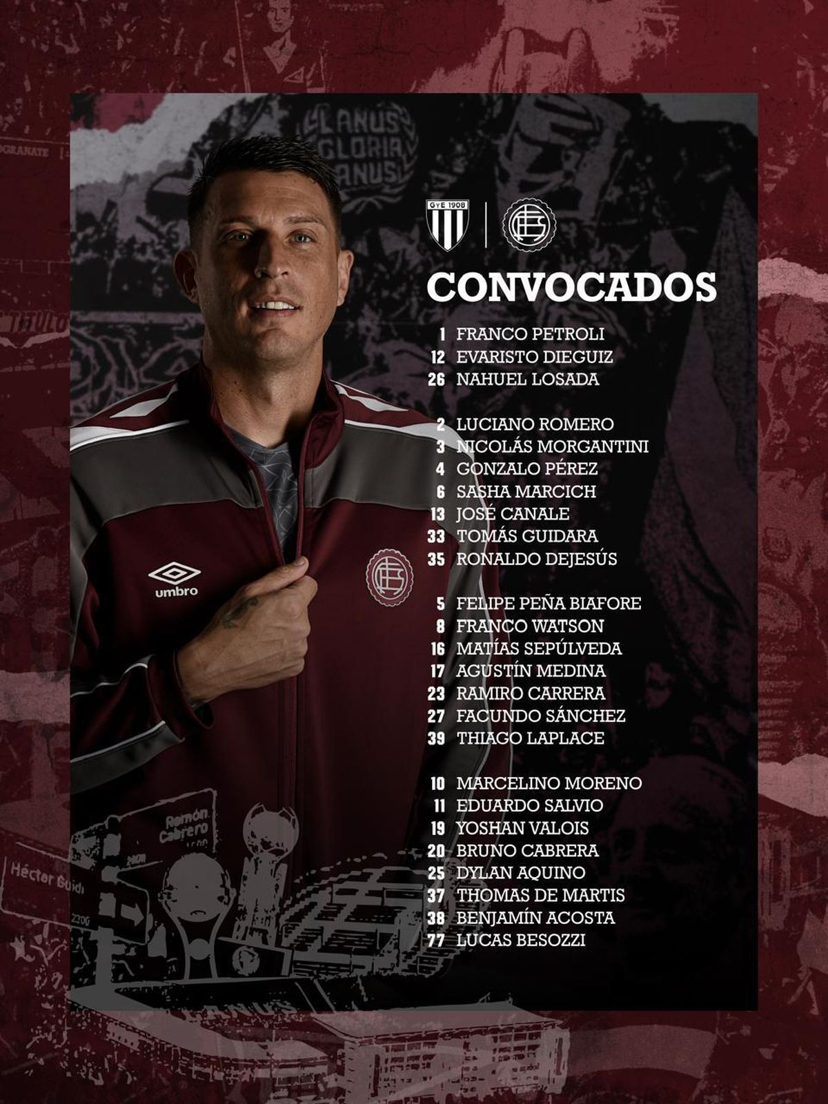 Lanús: Nahuel Losada; Tomás Guidara, Felipe Romero, José María Canale, Sasha Marcich; Agustín Medina, Felipe Peña Biafore; Eduardo Salvio, Marcelino Moreno, Lucas Besozzi; Ramiro Carrera. DT: Mauricio Pellegrino.