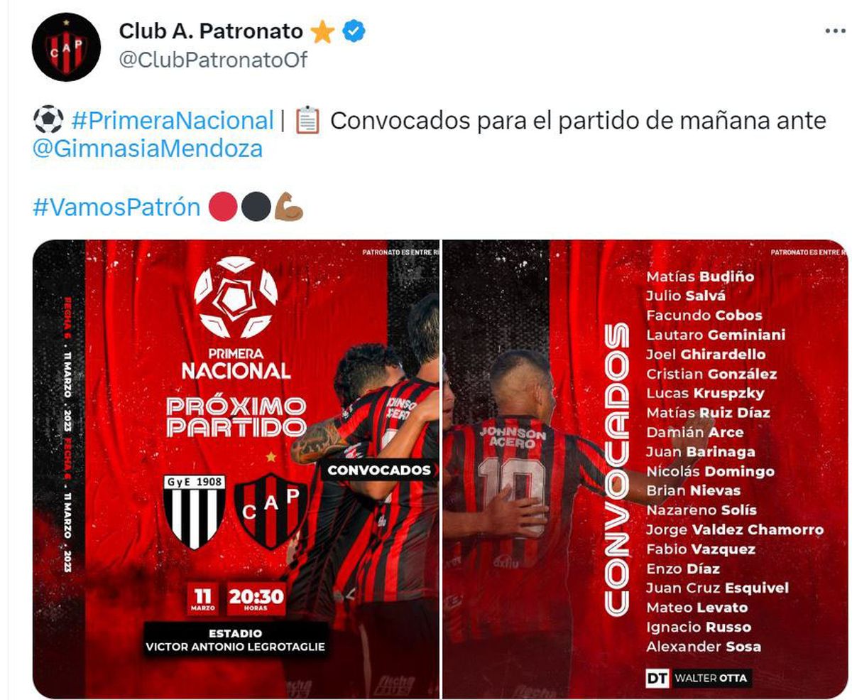 Patronato viene de golear 6 a 0 a Alvarado de Mar del Plata, en lo que fue su primera victoria en el campeonato de la Primera Nacional. El equipo rojinegro dirigido por Walter Otta suma 6 puntos, ya que previamente había sufrido una derrota y cosechó tres empates.