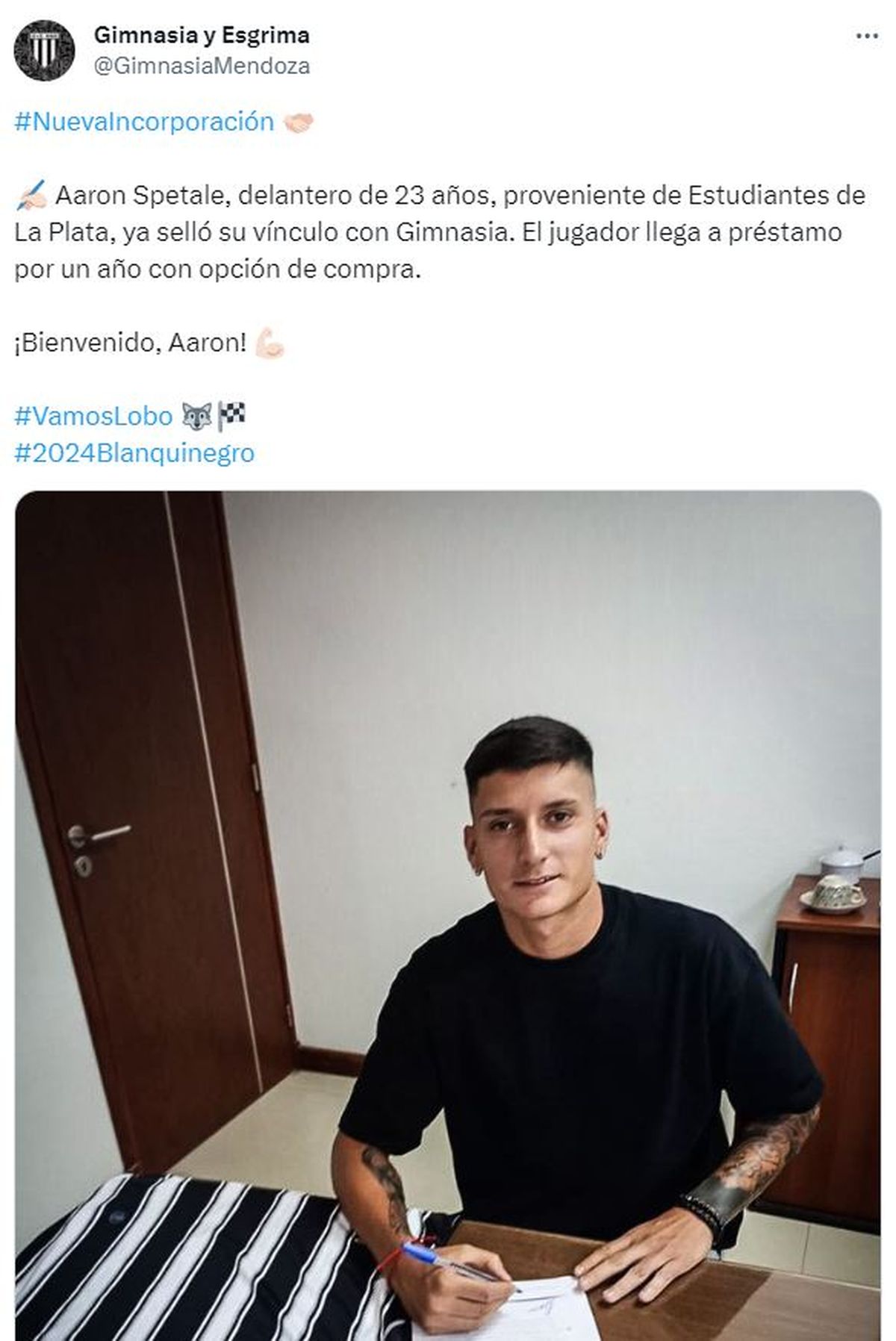 El delantero Aaron Spetale es el último refuerzo de Gimnasia y Esgrima. El delantero de 23 años viene de Estudiantes de La Plata, fue cedido a préstamo con opción de compra y ha realizado los dos primeros entrenamientos con el equipo.