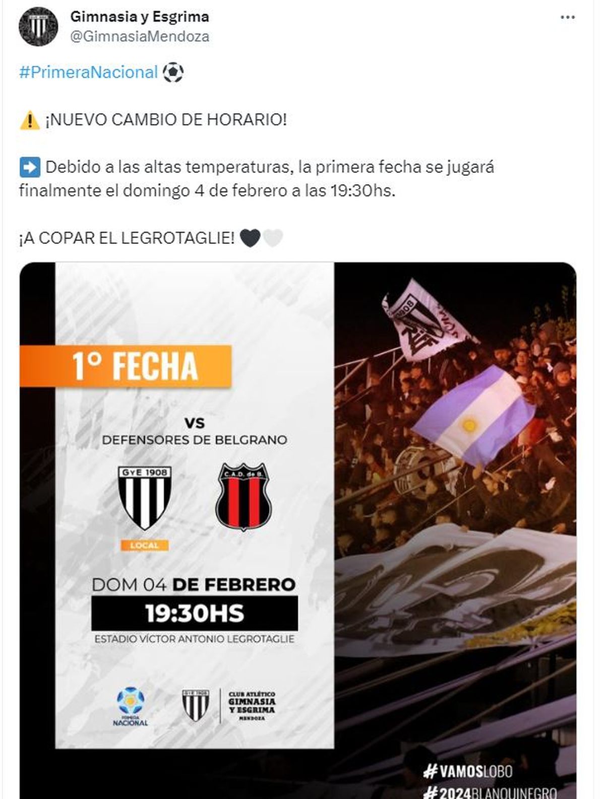 En principio el horario de inicio del partido estaba programado para las 17, después se supo que se iba a jugar a las 17.30, pero por pedido de la dirigencia de Gimnasia y Esgrima se jugará desde las 19.30 debido a las altas temperaturas.