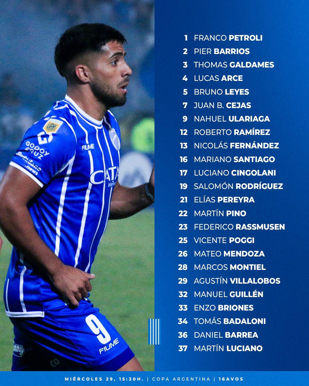Godoy Cruz: Franco Petroli o Roberto Ramírez; Manuel Guillén, Pier Barrios, Elías Pereyra y Martín Luciano; Mateo Mendoza, Marcos Montiel, Enzo Briones, Mariano Santiago; Martín Pino y Daniel Barrea. DT: Daniel Oldrá.