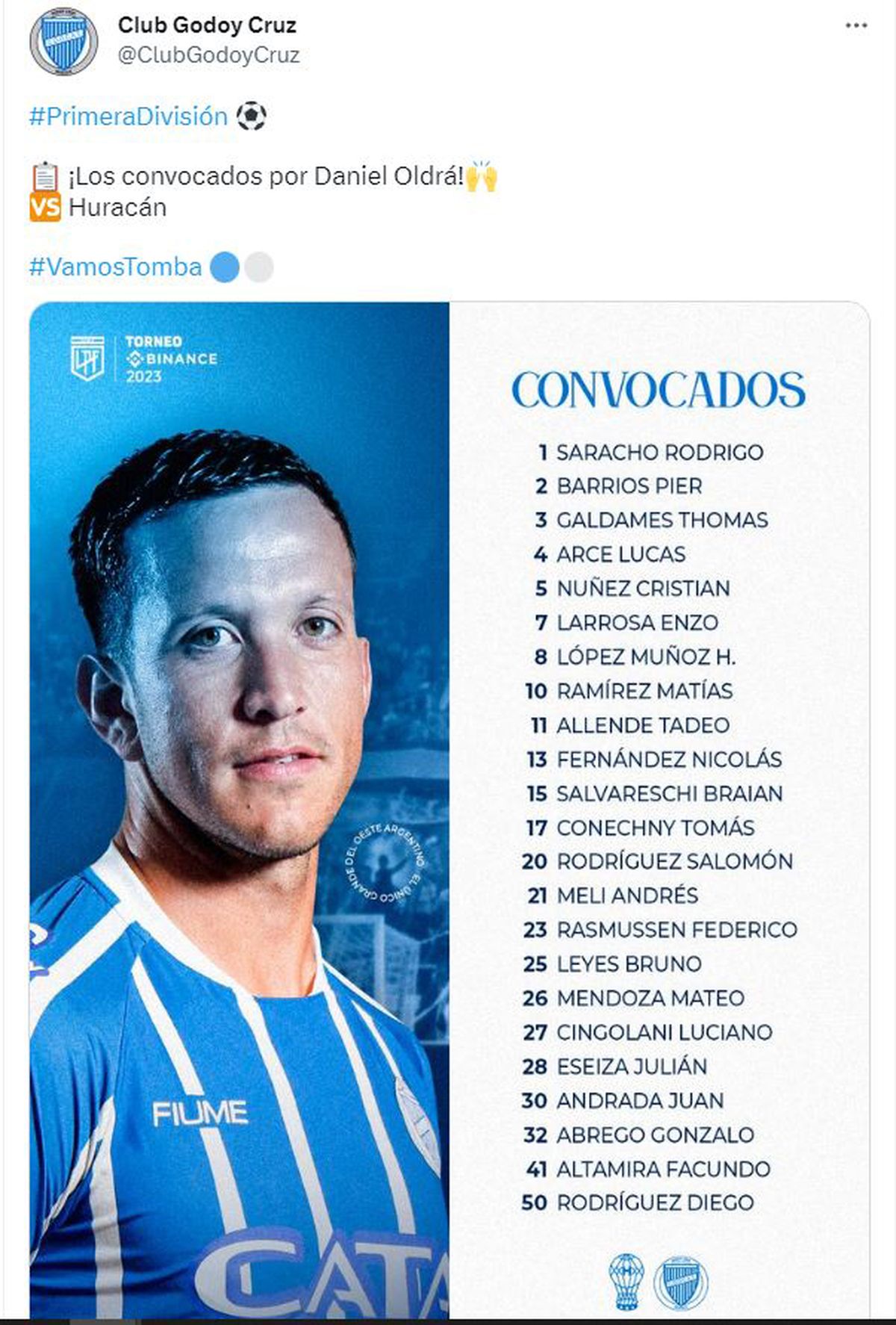 Godoy Cruz: Diego Rodríguez; Lucas Arce, Pier Barrios, Federico Rasmussen y Juan Andrés Meli; Gonzalo Abrego, Bruno Leyes, Nicolás Fernández y Hernán López Muñoz; Tadeo Allende y Salomón Rodríguez. DT: Daniel Oldrá.