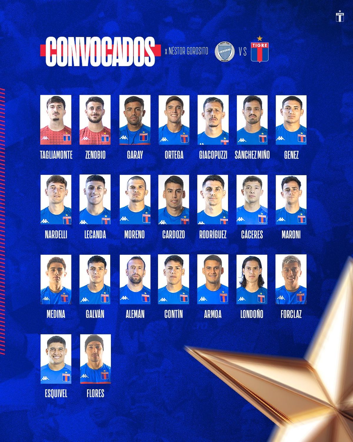Tigre: Matías Tagliamonte; Valentín Moreno, Gian Nardelli, Agustín Cardozo, Juan Manuel Sánchez Miño; Martín Garay; Walter Rodríguez, Brahian Alemán y Ezequiel Forclaz; Blas Armoa; y Gonzalo Flores. DT: Néstor Gorosito.