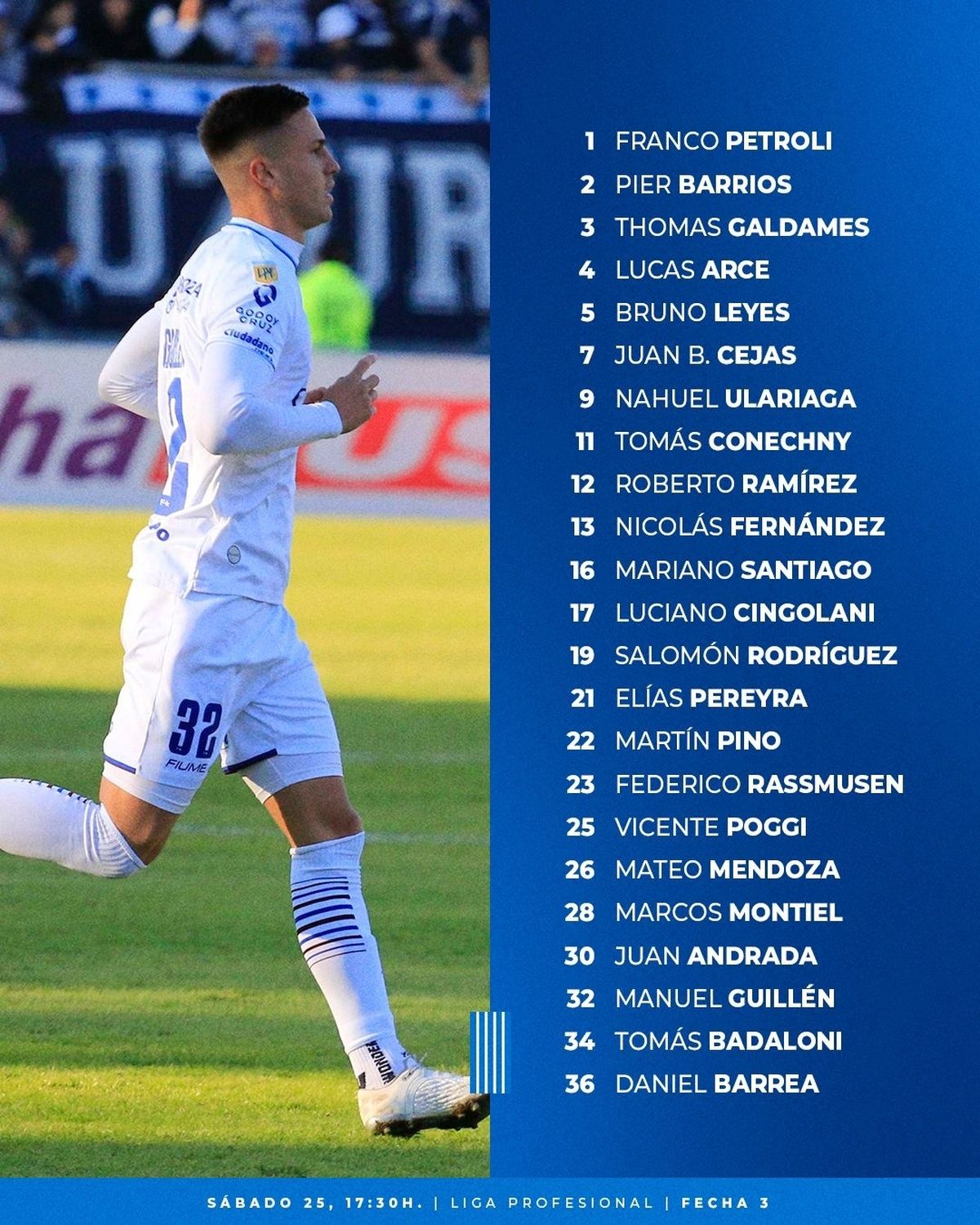 Godoy Cruz: Franco Petroli; Lucas Arce, Pier Barrios, Federico Rasmussen, Thomas Galdames; Nicolás Fernández, Bruno Leyes, Vicente Poggi y Juan Bautista Cejas; Tomás Conechny y Nahuel Ulariaga. DT: Daniel Oldrá.