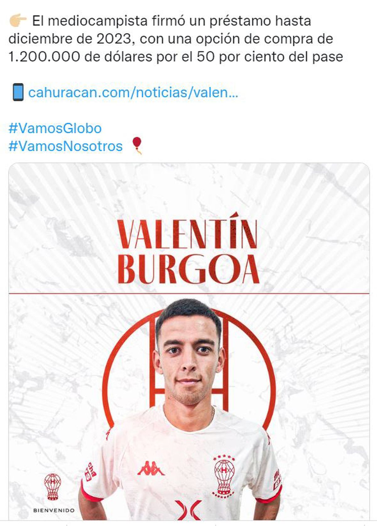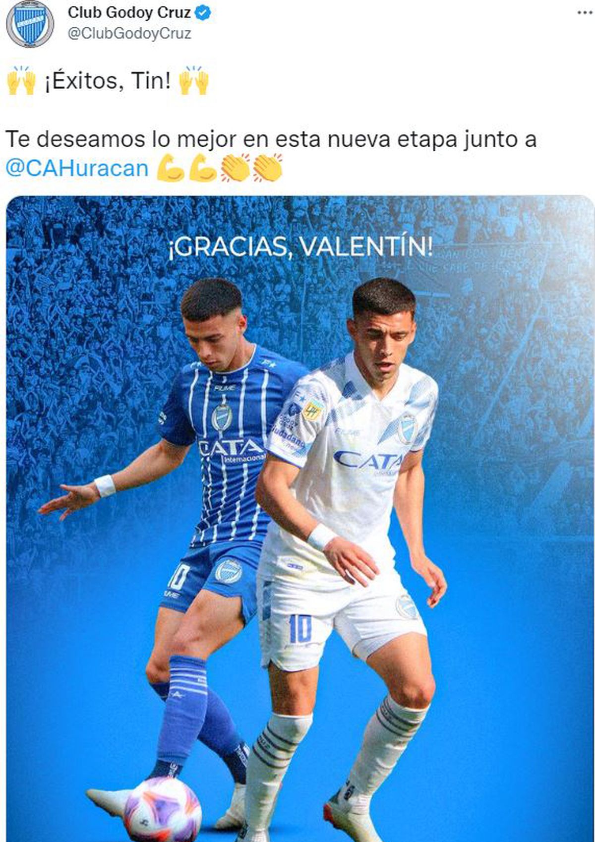 En sus redes sociales Godoy Cruz le deseo éxitos al volante Valentín Burgoa, quien seguirá jugando en Huracán de Parque Patricios. El mediocampista fue cedido a préstamo hasta diciembre de 2023, con una opción de compra de 1.200.000 de dólares por el 50% del pase.