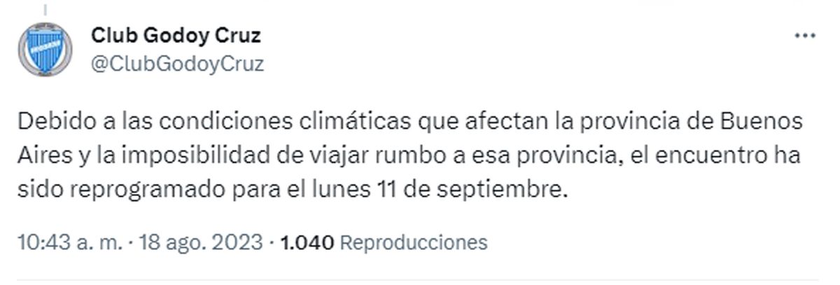 Luego agregaron: "Debido a las condiciones climáticas que afectan la provincia de Buenos Aires y la imposibilidad de viajar rumbo a esa provincia, el encuentro ha sido reprogramado para el lunes 11 de septiembre".
