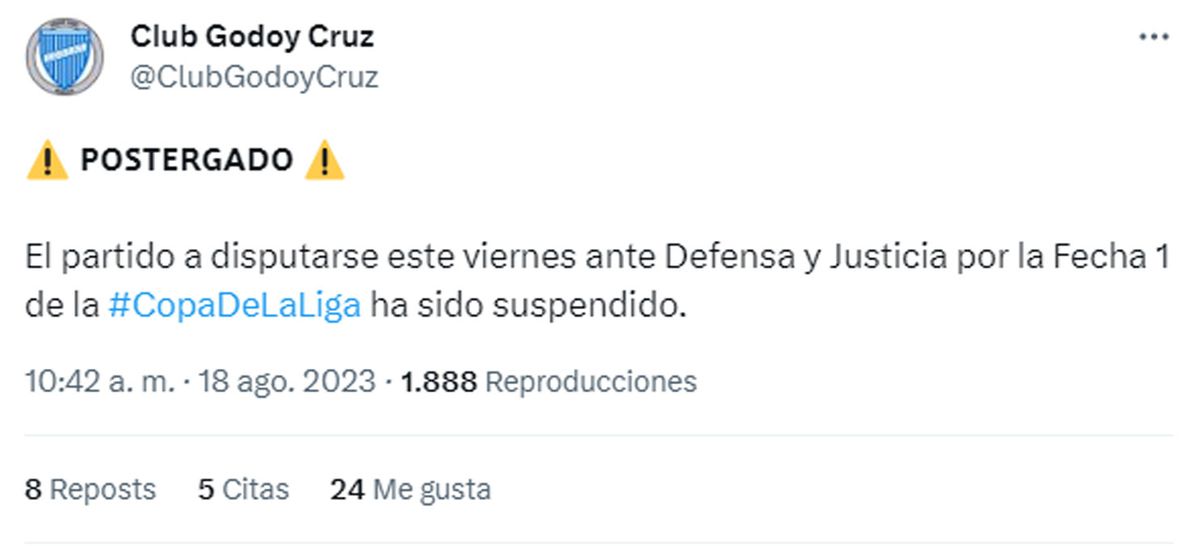 Godoy Cruz, luego de hacer lo imposible para jugar este viernes ante Defensa y Justicia, por la fecha inicial de la Copa de la Liga Profesional, informó que el encuentro fue suspendido a raíz de la suspensión de vuelos por las condiciones climáticas.