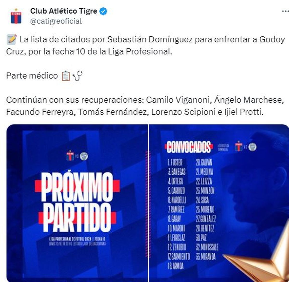 Tigre: Felipe Zenobio; Martín Ortega, Gian Nardelli, Brian Leiza y Nahuel Banegas; Agustín Cardozo, Martín Garay, Blas Armoa, Gonzalo Maroni; Tomás Galván y Florián Monzón. DT: Eduardo Domínguez.