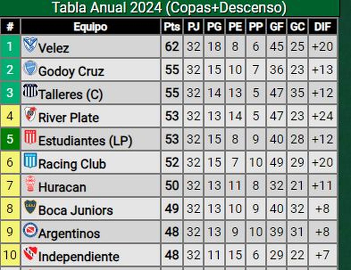 La meta es terminar entre los tres mejores de la tabla anual y aunque hoy está cuando aún restan disputarse 27 puntos, Godoy Cruz es el segundo mejor equipo de lo que va de la temporada, solo superado por Vélez que tiene 62 unidades y además es el líder de la Liga Profesional.