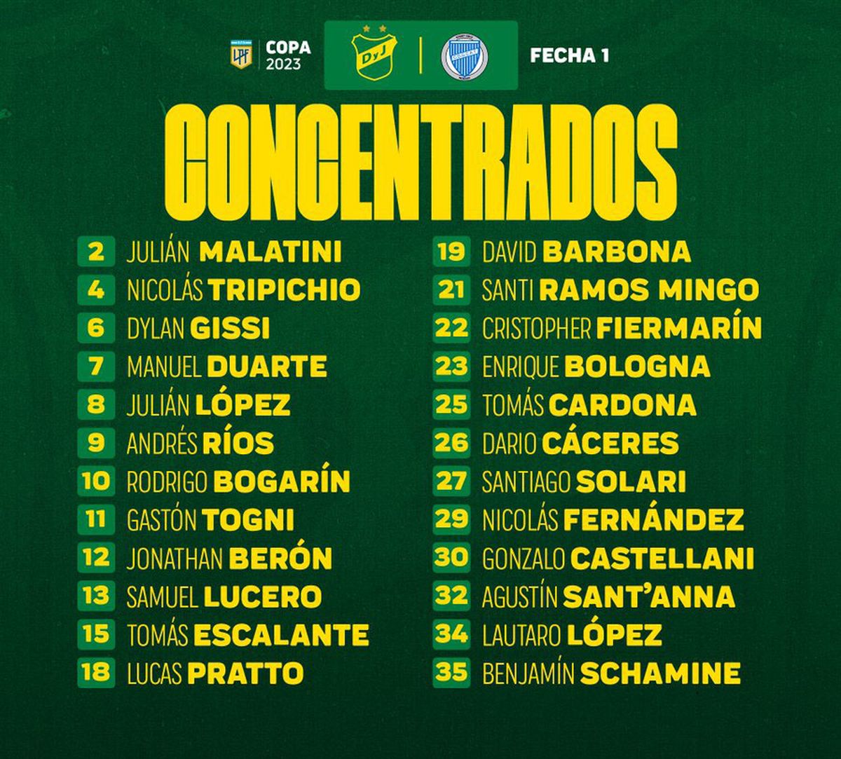 Defensa y Justicia: Enrique Bologna; Agustón Sant'Anna, Tomás Cardona, Santiago Ramos y Darío Cáceres; Nicolás Tripicchio, Julián López, David Barbona y Santiago Solari; Nicolás Fernández y Gastón Togni. DT: Julio Vaccari.