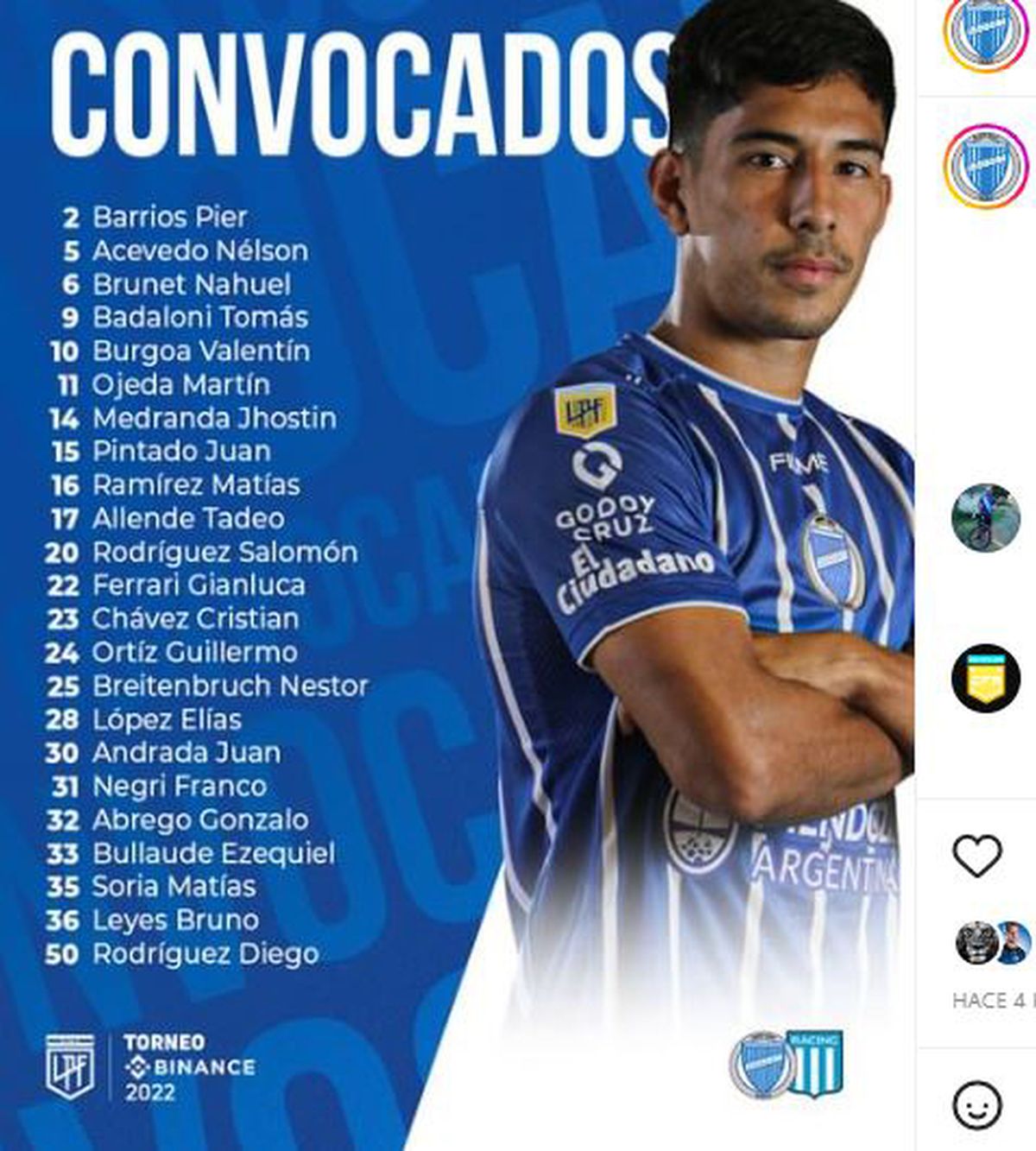 Godoy Cruz se presentará este domingo ante Racing en el estadio Malvinas Argentinas, desde las 15.30, en su debut de local en la Liga Profesional. El árbitro designado es Facundo Tello y el partido contará con la televisación de TNT Sports.