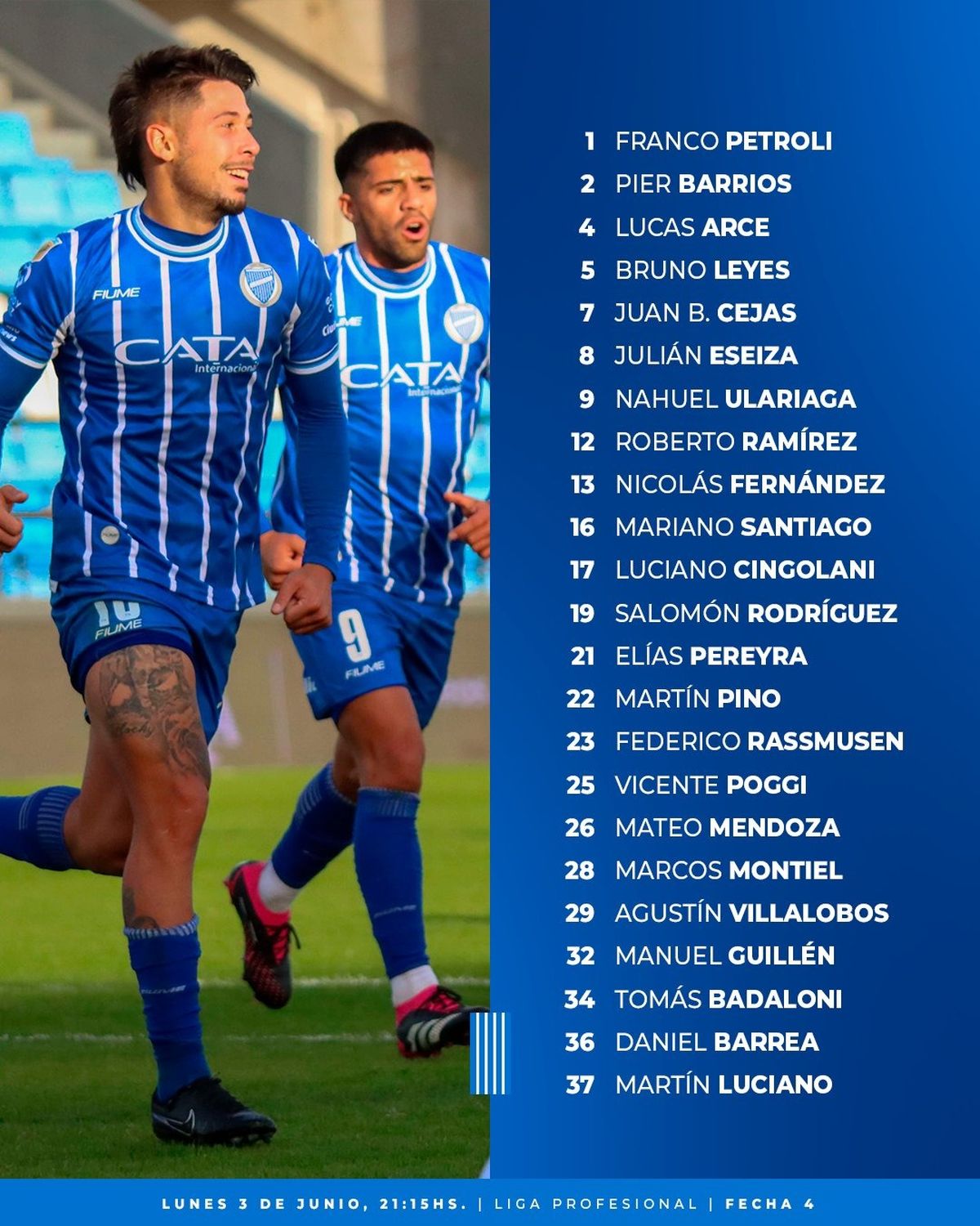 Godoy Cruz: Franco Petroli; Lucas Arce, Pier Barrios, Federico Rasmussen, Elías Pereyra; Vicente Poggi, Nicolás Fernández, Bruno Leyes, Juan Bautista Cejas; Tomás Badaloni y Nahuel Ulariaga. DT: Daniel Oldrá.