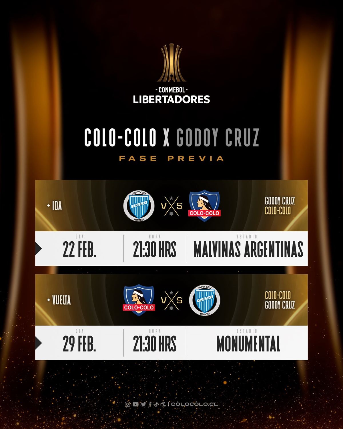 Se confirmaron los días que Godoy Cruz se medirá con Colo Colo de Chile, por la fase 2 de la Copa Libertadores. La Conmebol confirmó los horarios de los dos partidos.