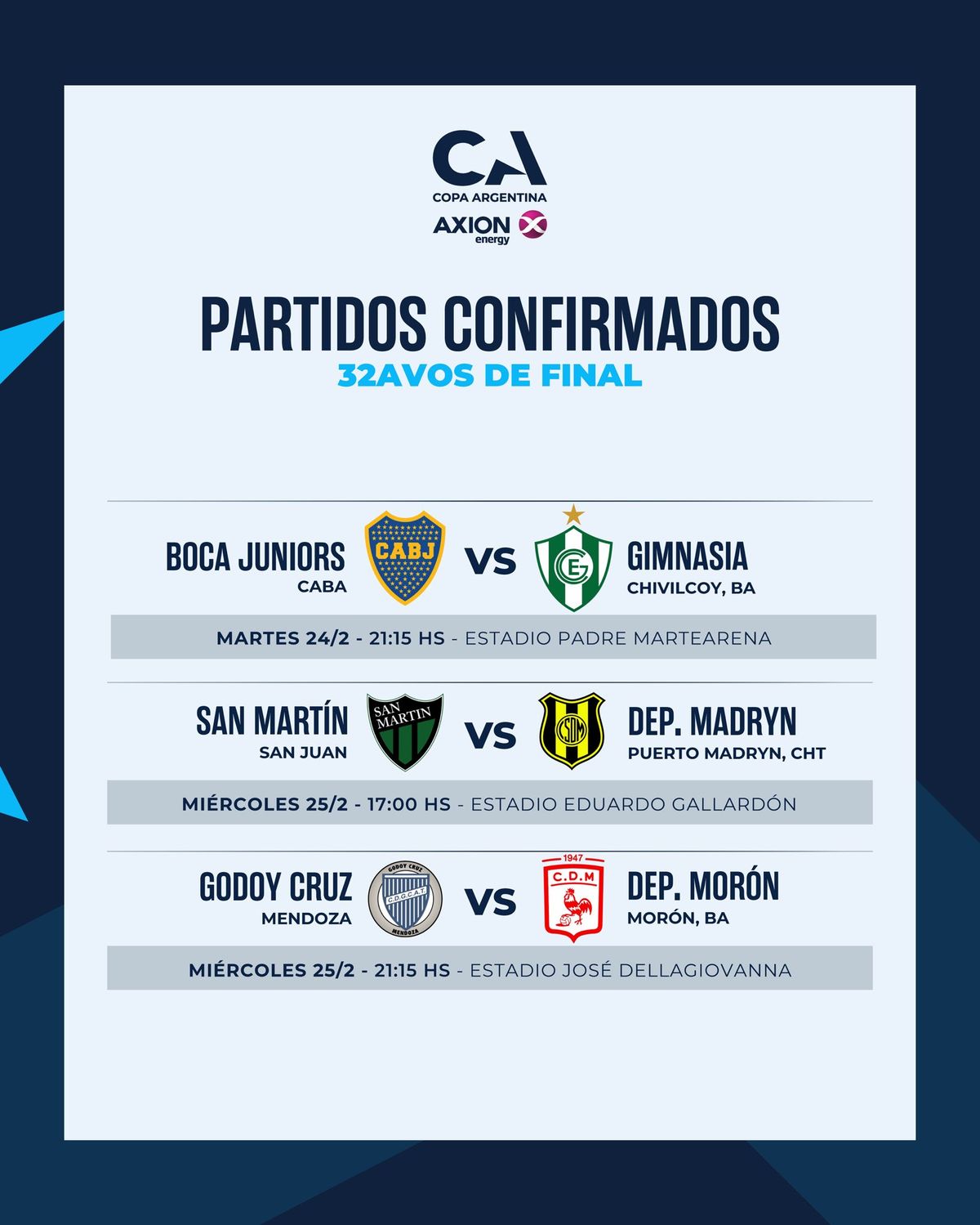 Este lunes desde la organización de la Copa Argentina confirmaron el día, el escenario y la hora del cruce de los 32avos de final de la Copa Argentina que tendrá como protagonista a Godoy Cruz y el Deportivo Morón. El Tomba y el Gallito se medirán el próximo miércoles 25 de febrero, desde las 21.15, en el estadio Estadio José Dellagiovanna que pertenece a Tigre.