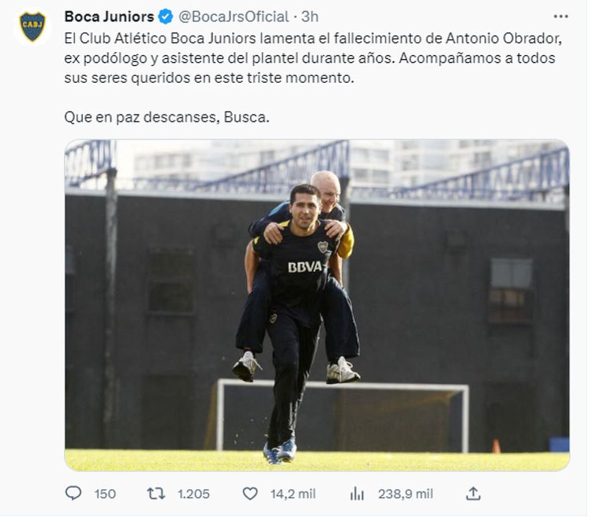 “El Club Atlético Boca Juniors lamenta el fallecimiento de Antonio Obrador, ex podólogo y asistente del plantel durante años. Acompañamos a todos sus seres queridos en este triste momento. Que en paz descanses, Busca”, dijo el Xeneize.