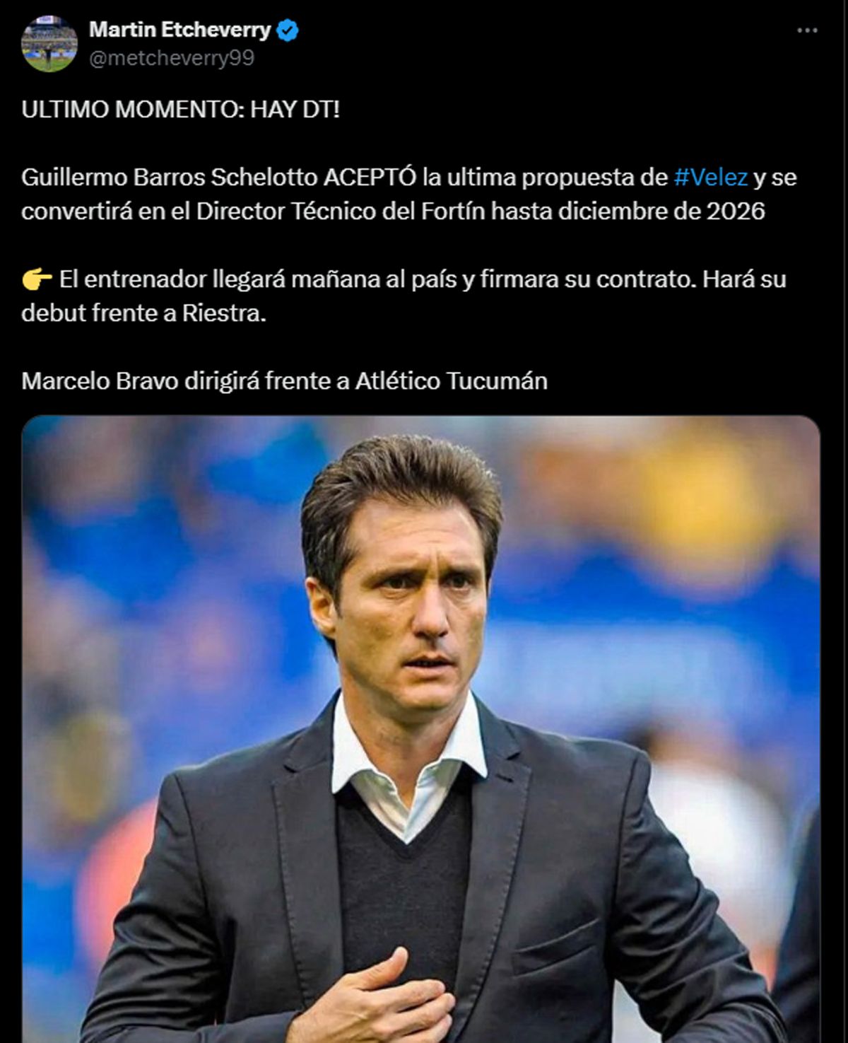 Luego de que el entrenador de la Reserva, Marcelo Bravo, dirija al primer equipo en la victoria por 1-0 ante San Martín de San Juan el pasado viernes en condición de local, la Comisión Directiva logró llegar a un acuerdo con Guillermo Barros Schelotto para que se convierta en el nuevo entrenador del vigente campeón del fútbol argentino.
