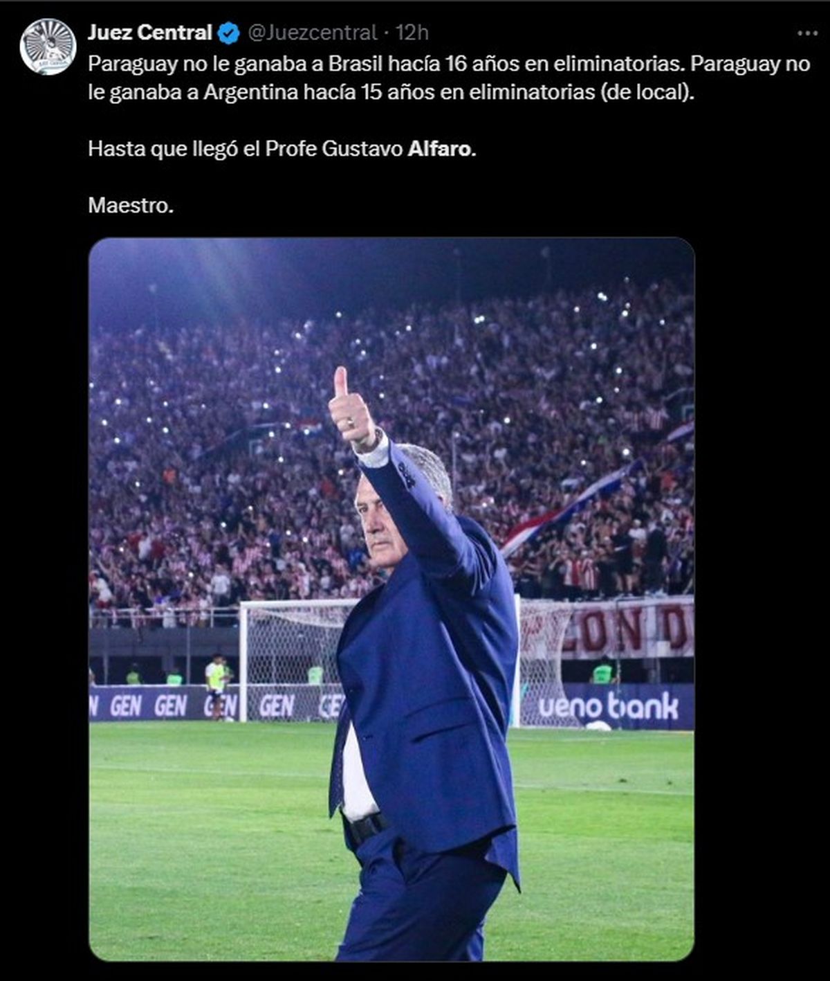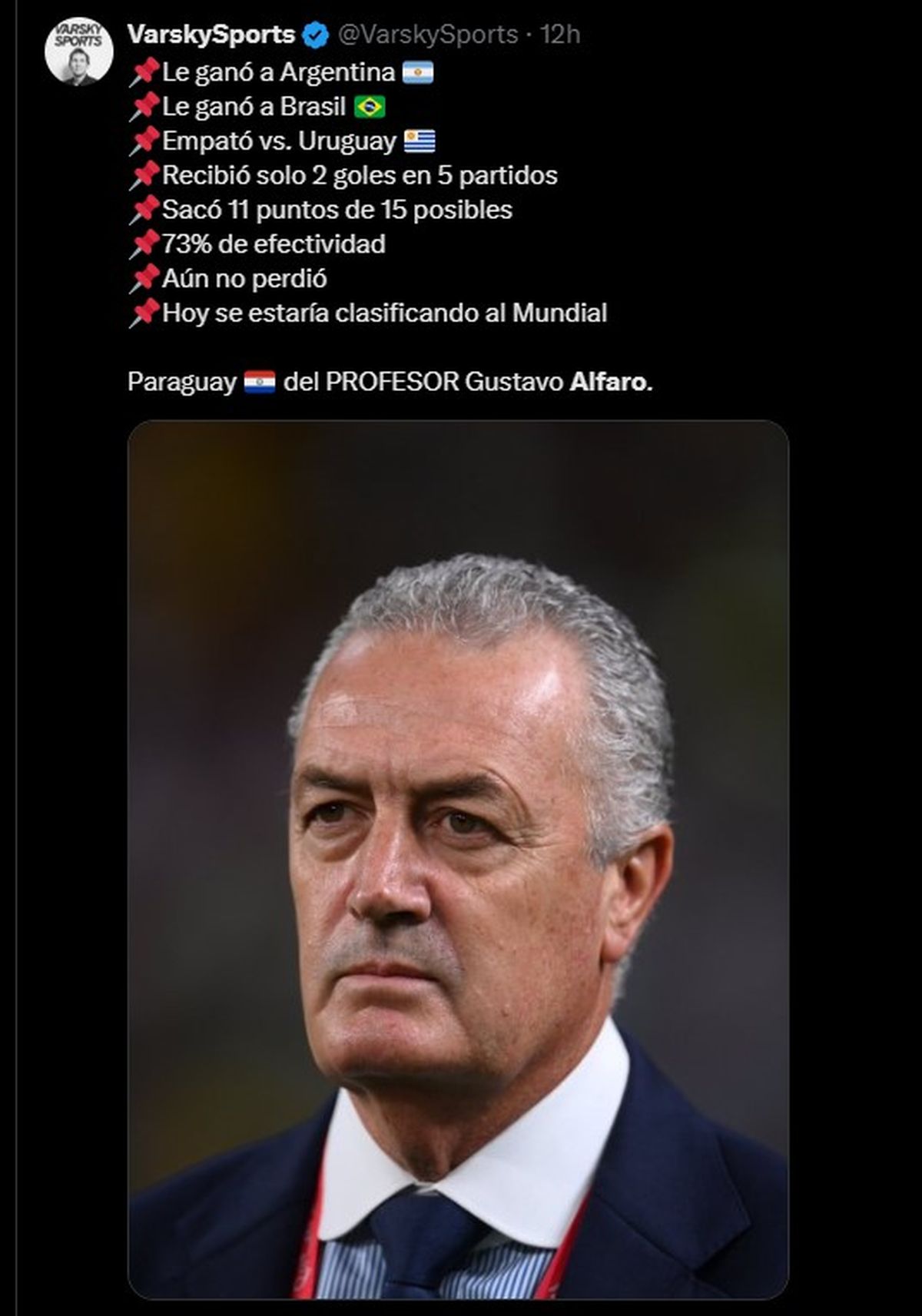 El equipo local superó a la “Albiceleste” por 2-1 con un gol de chilena de Antonio Sanabria y otro del defensor Omar Alderete y Alfaro comenzó sus declaraciones hablando sobre la jerarquía de Argentina y su diferencia con Paraguay: “Cuando uno se enfrenta al campeón del mundo en vigencia de nivel, en la vigencia de ser el campeón de las dos últimas Copas Américas también, de ser el líder de la eliminatoria, con jugadores premiados con justicia, con la jerarquía que tiene en el plantel, con el mejor jugador del mundo, enfrentarlo desde la humildad y rebeldía era un desafío, más cuando empezás perdiendo, eso era meramente futbolístico”.