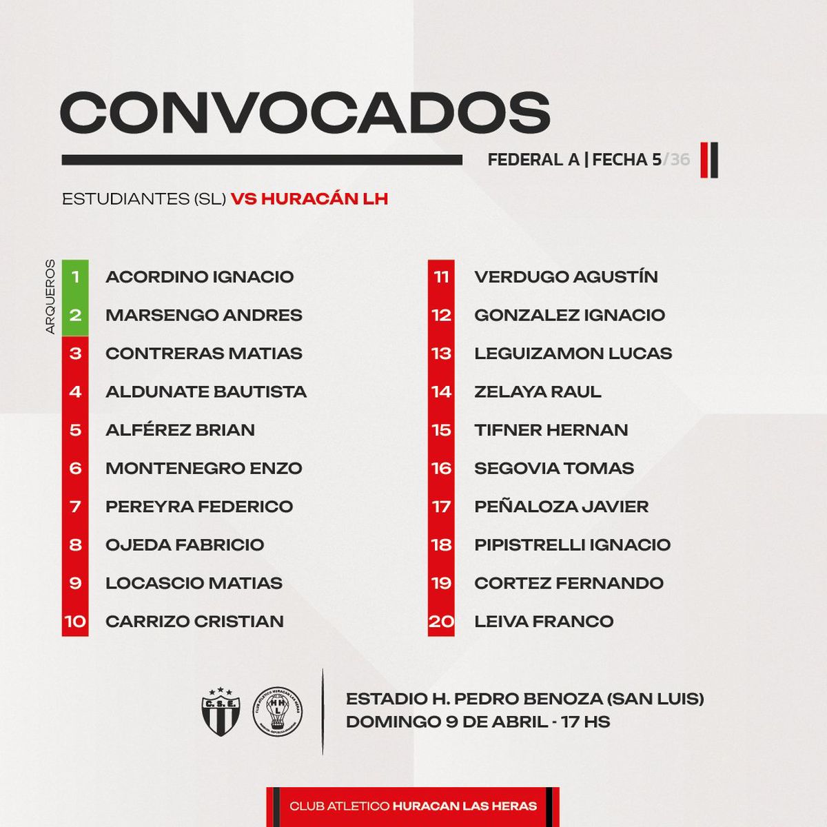 Huracán Las Heras: Ignacio Acordino; Fabricio Ojeda, Matías Contreras, Brian Alferez y Enzo Montenegro; Ignacio González, Agustín Verdugo, Cristian Carrizo y Fernando Cortés; Javier Peñaloza y Tomás Segovia. DT: Alejandro Abaurre.