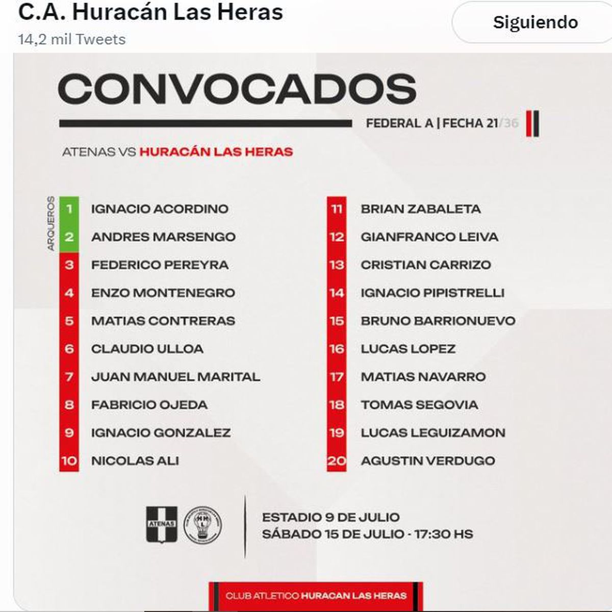 Huracán Las Heras se medirá este sábado desde las 17.30 con Atenas, de Río Cuarto, en un partido correspondiente a la 21ma fecha de la tercera ronda de la Zona B del torneo Federal A.
