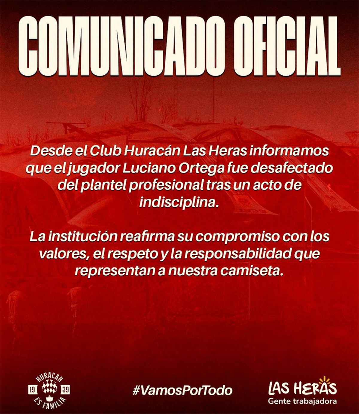 "Desde Huracán Las Heras informamos que el jugador Luciano Ortega fue desafectado del plantel profesional tras un acto de indisciplina. La institución reafirma su compromiso con los valores, el respeto y la responsabilidad que representan a nuestra camiseta", dijo en un comunicado el club lasherino, que viene de perder por 2 a 0 ante Juventud Unida de San Luis por el Federal A.