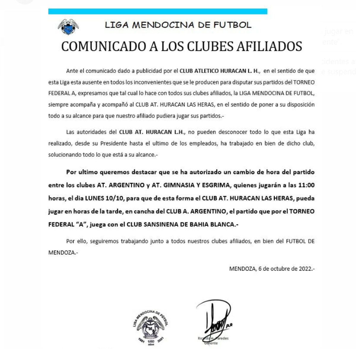 Este jueves, la Liga Mendocina emitió un comunicado apoyando a Huracán Las Heras y autorizó a que el partido del lunes 10 de octubre entre Argentino y Gimnasia se juegue a las 11 de la mañana para que de esa manera el Globo y Sansinena puedan hacerlo por la tarde, en el mismo escenario.